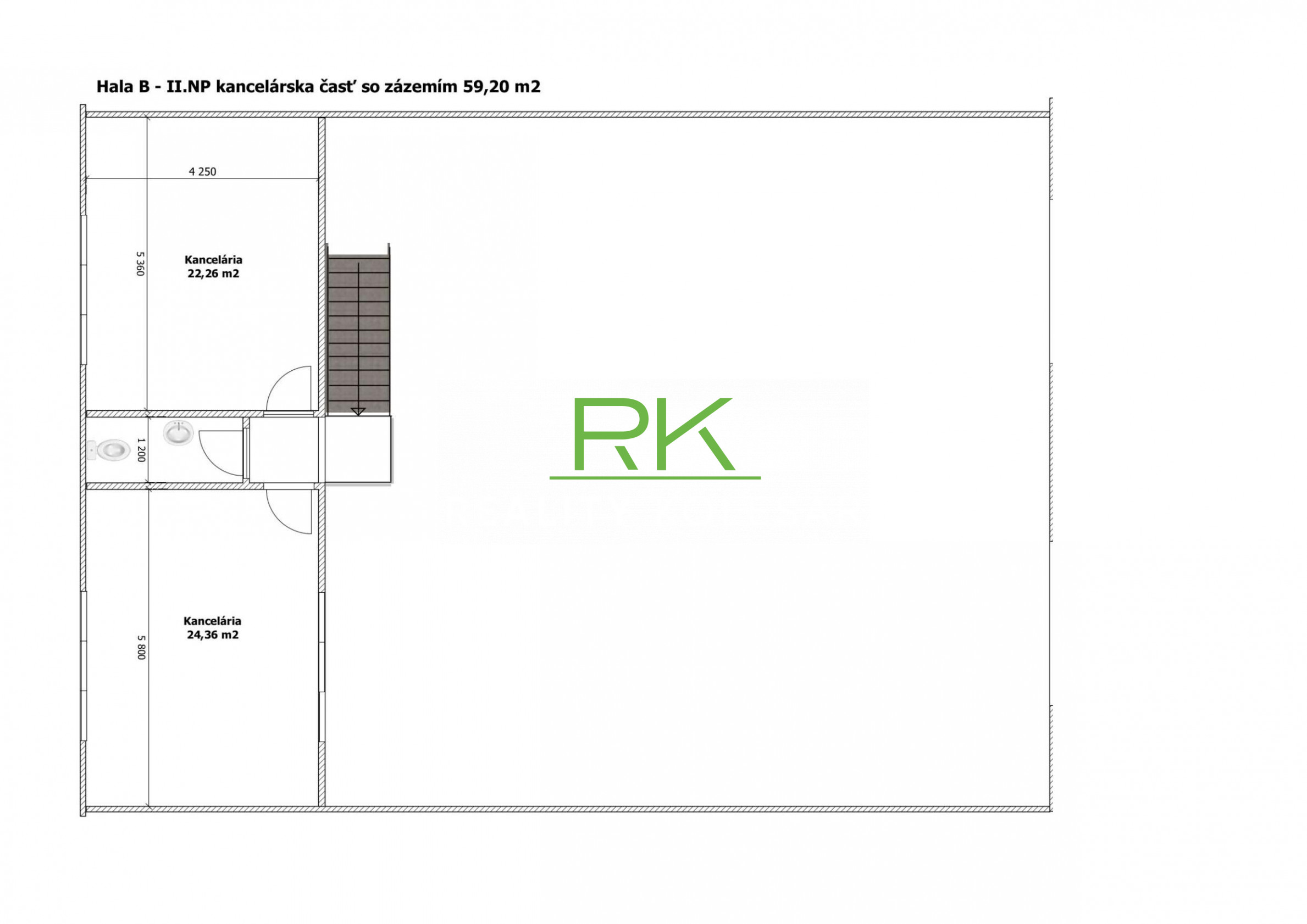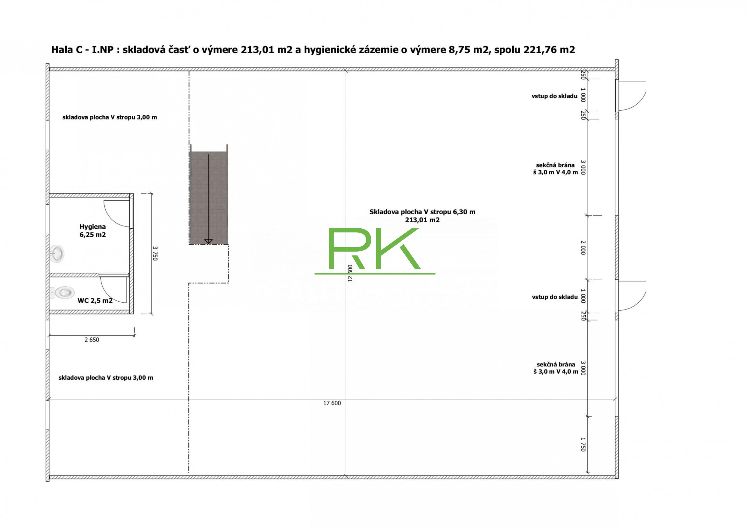 Skladová plocha 220 m2, z toho cca 53,75 m2 s výškou stropu 3,00 m a zvyšok s výškou 6,30 m, oddelená hygiena 8,75 m2 ( WC, výlevka a umývadlo )